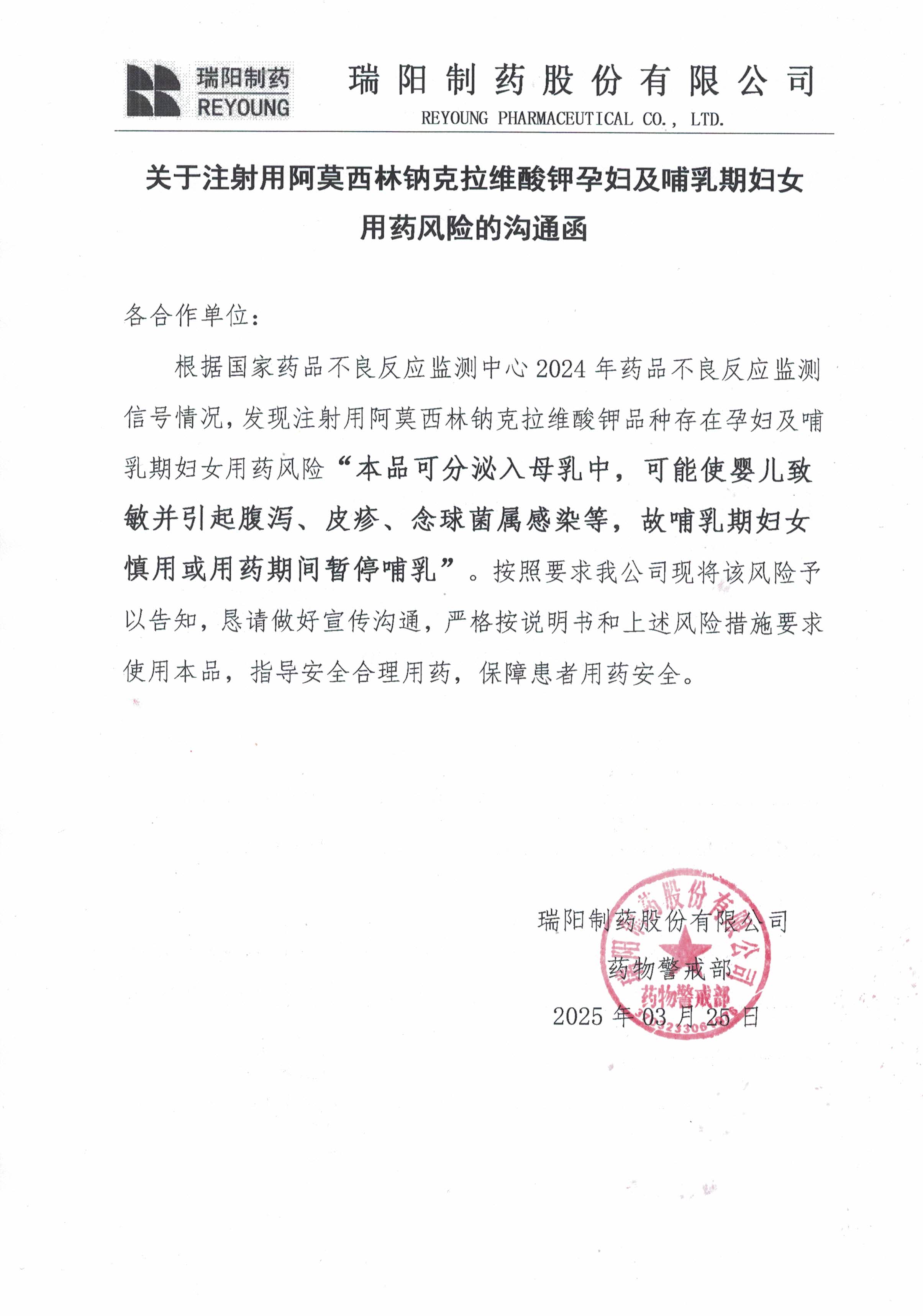 關于注射用阿莫西林鈉克拉維酸鉀孕婦及哺乳期用藥風險的溝通函
